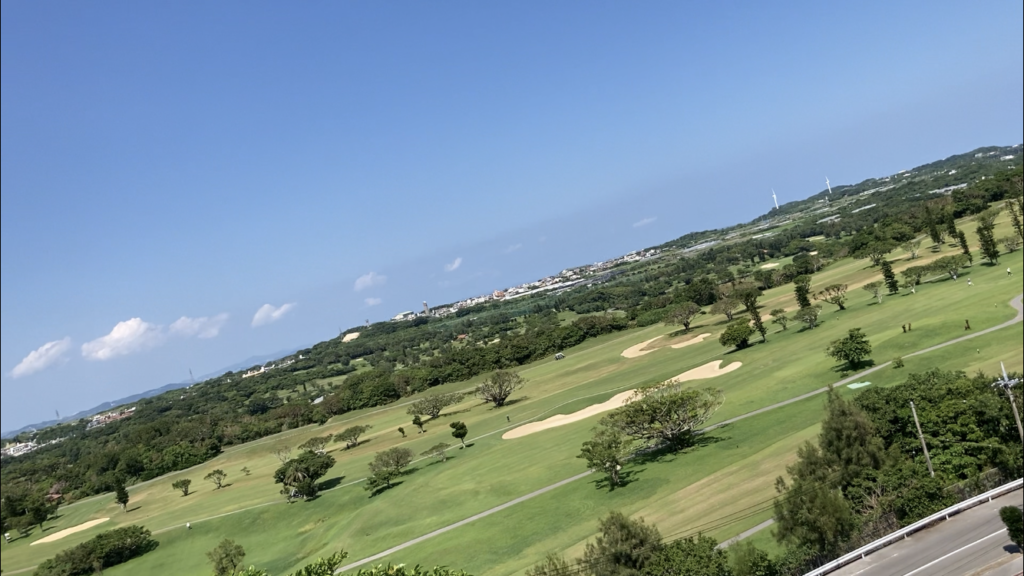 振り返ると、広々としたゴルフ場と