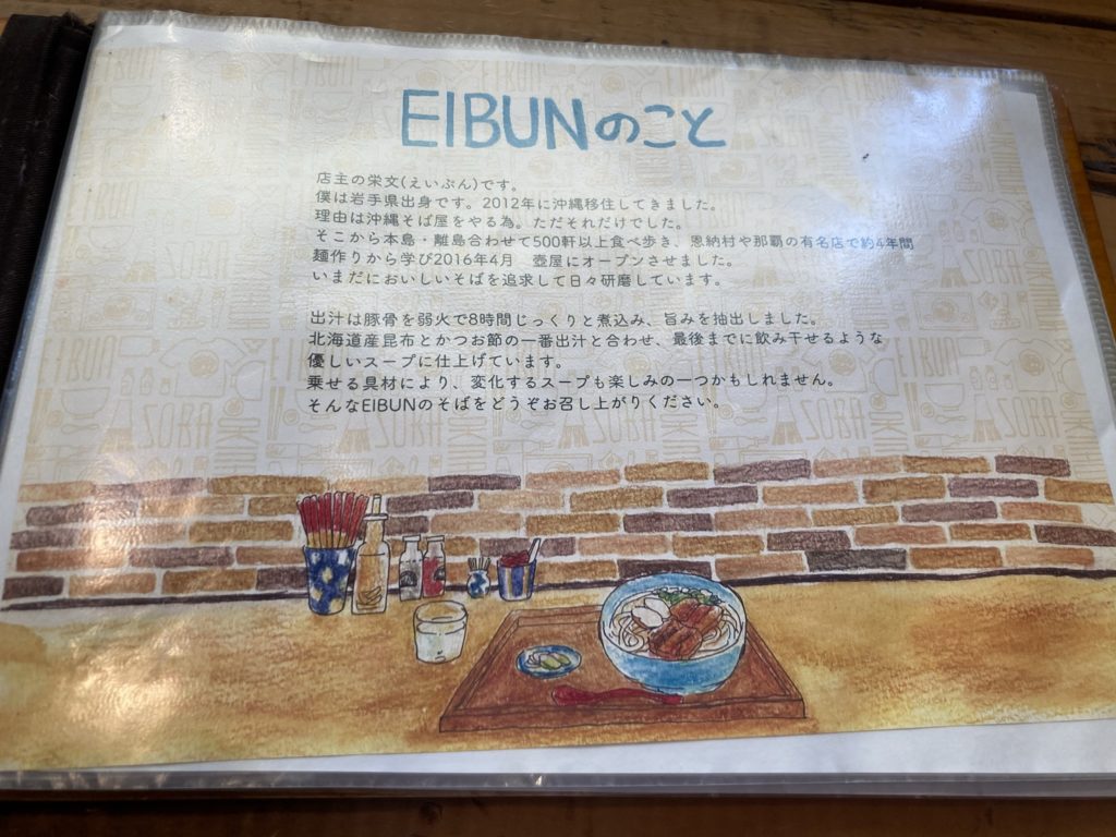 店主の栄文(えいぶん)です。僕は岩手県出身です。2012年に沖縄移住してきました。       理由は沖縄そばをやる為。ただそれだけでした。                        そこから本島⇒離島合わせて500軒以上食べ歩き、恩納村や那覇の有名店で4年間          麺作りから学び2016年4月 壺屋にオープンさせました。                    いまだにおいしいそばを追求して日々研磨しています。