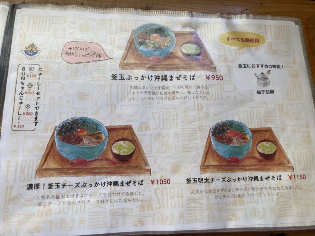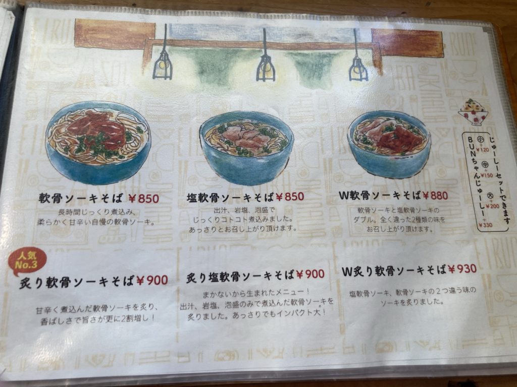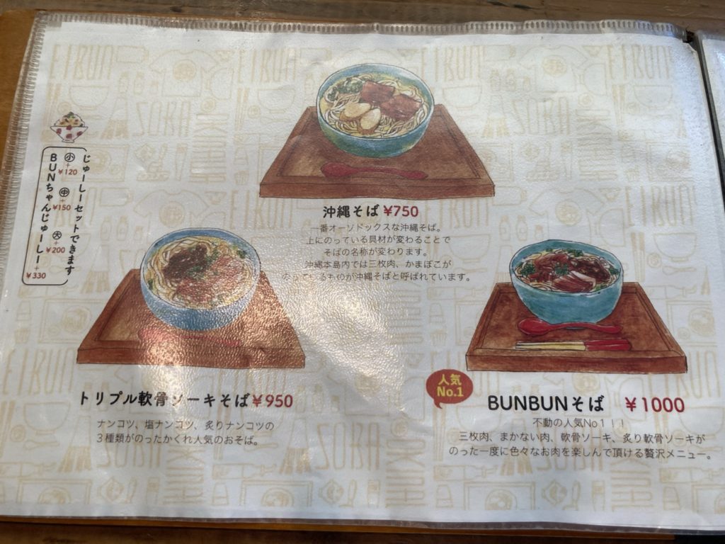 炙りソーキの香ばしいさと、濃厚な味のお肉と焦げ目の組み合わせが絶妙!こんなに濃厚なソーキは初めてです!                                         軟骨ソーキは、見た目に寄らずとっても柔らかくて、唇で挟むだけで千切れてしまいそう。いっしょにほっぺたも落ちちゃいます。                                 麺はコシがあって、お肉達と一緒に食べるとまた色んな味と食感を楽しめます!          沖縄そばは、比較的薄味なイメージでしたが、BUNBUNそばは、濃厚な味でした!         いくらでも食べれちゃいそうでしたが、意外とお肉達のボリュームがすごくて、食べ終わったころにはお腹いっぱいになりました!                                 面白そうなメニューがたくさんあるので、また来る日が楽しみです。