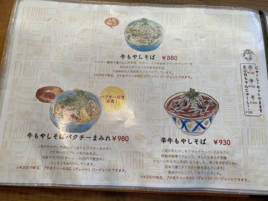 『にんにく醤油で漬け込んだ牛肉、もやし、にら炒めブラックペッパーを効かせたボリュームあるおそば。大宜味村の人気店をインスパイアしています。』
