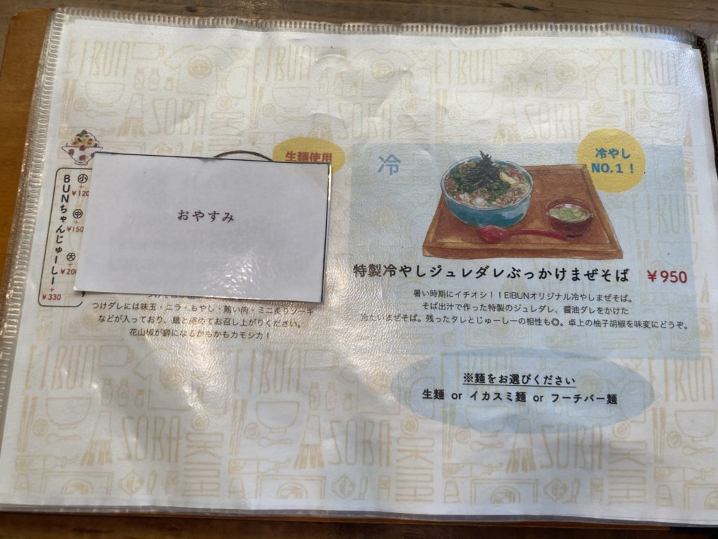 暑い時期にイチオシ!!EIBUNオリジナル冷やしまぜそば。そば出汁で作った特製のジュレダレ。醤油ダレをかけた冷たいまぜそば。残ったタレとじゅーしーの相性も◎。卓上の柚子胡椒を味変にどうぞ。