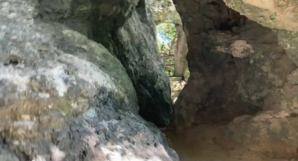 自然に出来た洞窟が!人一人がやっと通れる大きさです。緊張です。足元、天井を注意深くチェックしながら進みます。