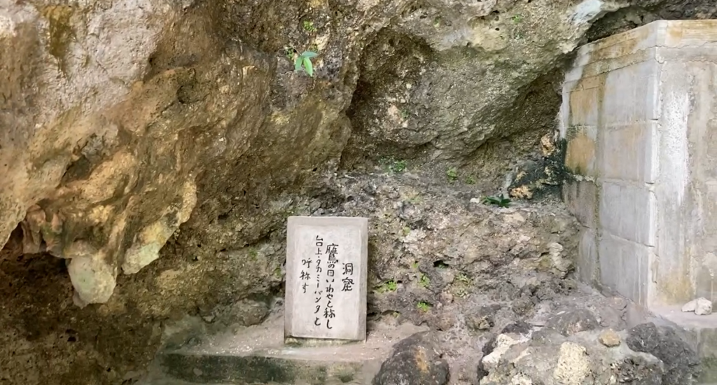 この場所は、洞窟「タカミーバンタ(鷹の目の崖)」ということが発覚。後で調べて分かったことは「その昔、クーデターが起きた時に、今帰仁城(北部)主の丘春は、この地まで逃げ延び、この洞窟に身を潜め、再起をを図った」という。