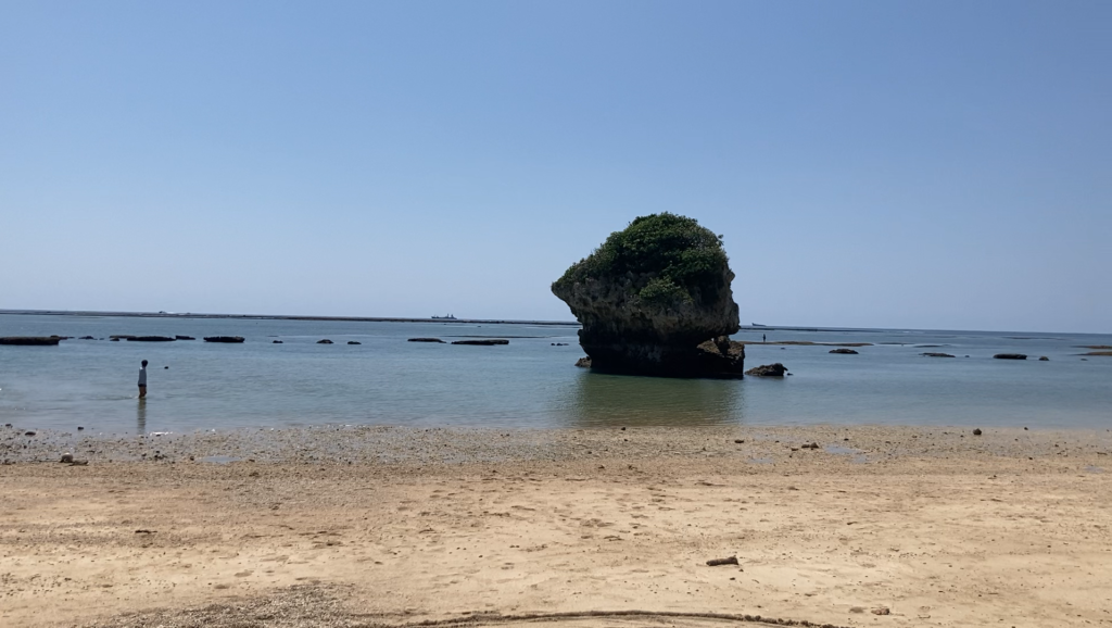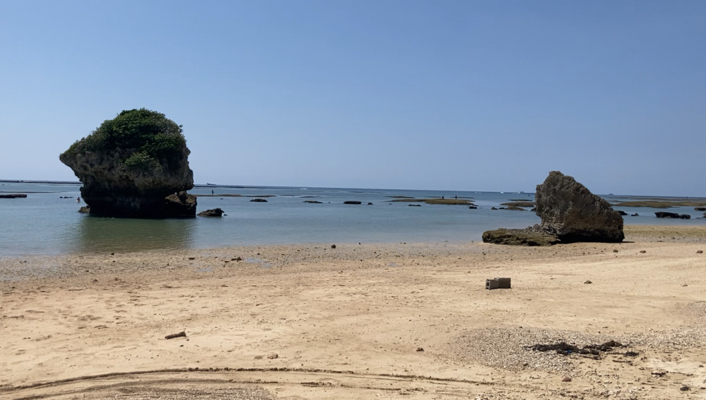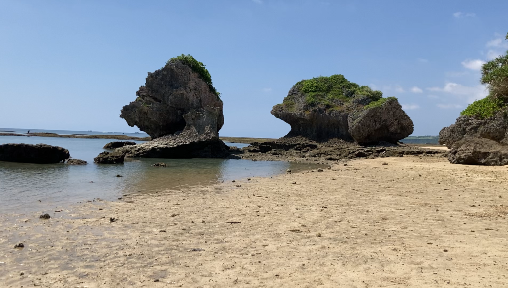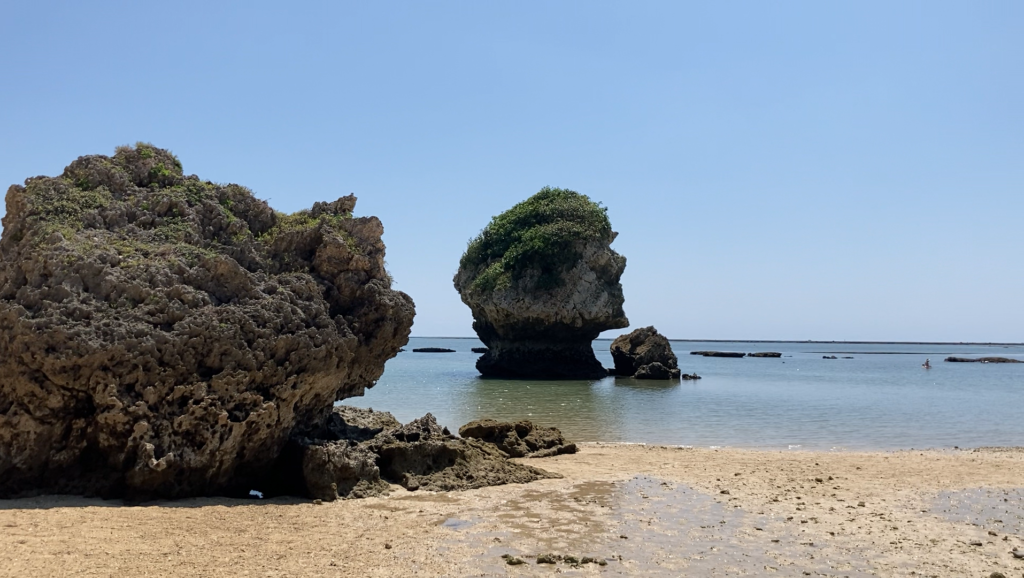 今回ご紹介するのは、那覇空港から車で46分、沖縄県南部の『新原ビーチ(みーばるビーチ)」です。 新原ビーチは、奇岩が印象的な、自然たっぷりのビーチ。