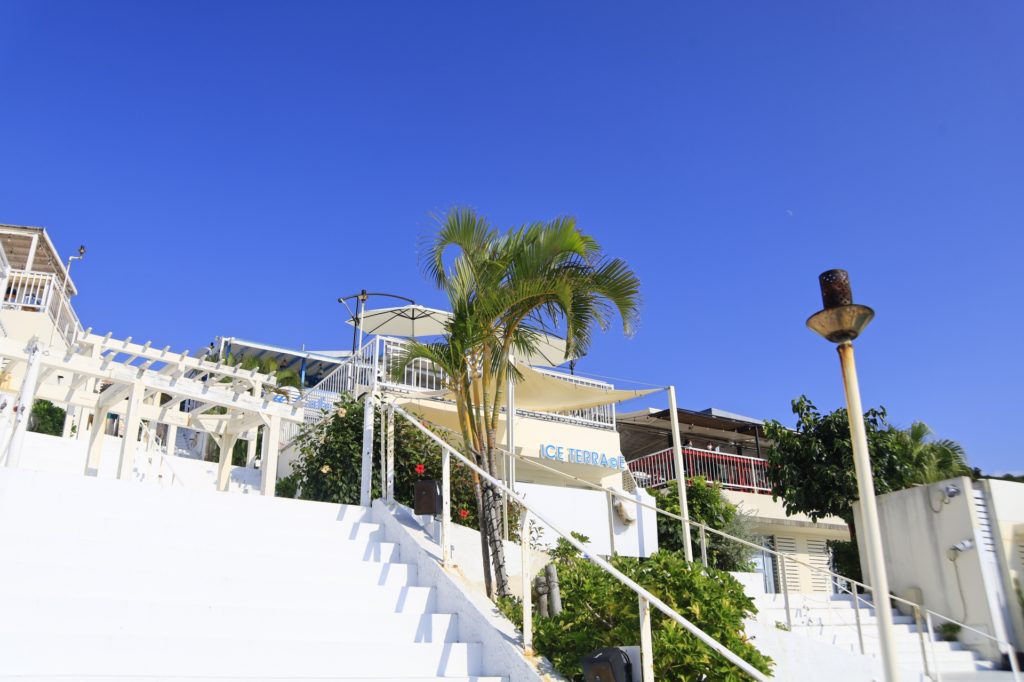 朝風呂にも入った事ですし、お食事をして、そのあとはショッピング等はいかがでしょうか?ホテルをから出て、綺麗な海を眺めながら下って行くと、すぐ到着!