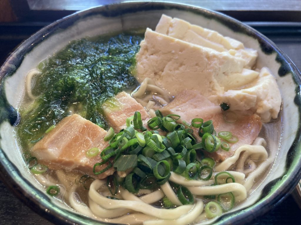 空港からも近く駐車場も広いので、スムーズに到着する事が出来ると思います。お店は、オーナーの祖父の古民家を改装した店内。雰囲気はどっぷりと沖縄感を味合わえます。 コチラは「県産アーサーとゆし豆腐そば」 コシのある麺と、コクのあるスープがたまりません!