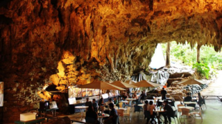 「ガンガラーの谷」にある洞窟カフェ。天然の鍾乳洞をそのまま利用し、洞窟の中の神秘的な雰囲気を味わいながら休憩することができます。※ツアーを予約してないと入れないので、ガンガラーの谷の後には、カフェでゆったりどうぞ!